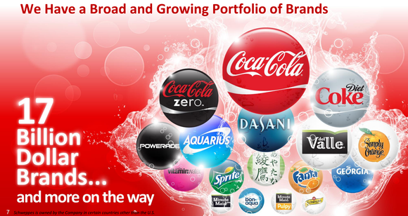 Coca-Cola is the undisputed leader in the global soft drinks market: the company owns 17 brands that bring in over $1 billion each in annual global revenue. It also has a growing pipeline of 20 smaller and growing brands that each generate annual sales of between $0.5 billion and $1 billion, many of which are probably on their way to becoming billion-dollar names.