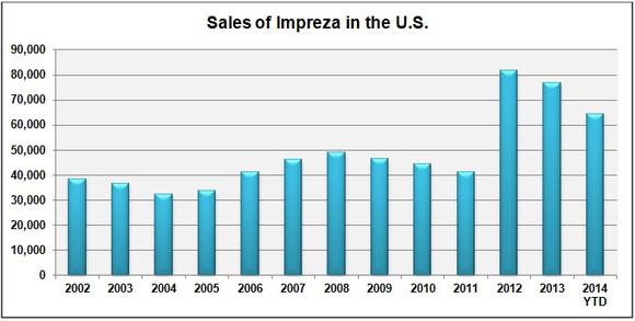 2012 was a big sales year for the car, and coincided with the launch of the fourth-generation model. The fully redesigned 2012 Impreza featured a roomier and more stylish interior, standard AWD, improved safety measures, better mileage, and a powerful four-cylinder engine. The prime differentiator between it and similar offerings in the compact-car market was the AWD. 2013 saw a dip of 6% in sales, this time probably due to the slowing demand for small cars in the U.S. as buyers' preference shifted to SUVs.