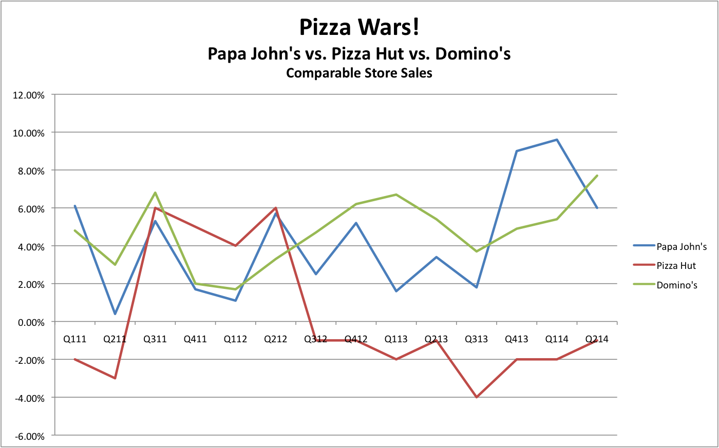 Even so, the upstart is able to hold its own when it comes to return business. Same store sales at Papa John's came in at 6% last quarter, below a resurgent Domino's, which saw comps rise 7.7% but well above Pizza Hut, which continues to see negative comparable sales.