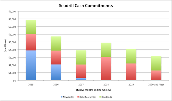 If the drilling market had high demand, we would expect that Seadrill could fund newbuilds with new debt, and roll old debt into longer maturities; but if debt markets have lost faith in the company's cash flows, that may not be so easy. The simple fact is that Seadrill has billions in commitments in the next two years, and its current stream of cash flows won't cover those obligations and the dividend.
