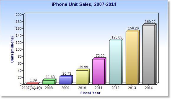 The second factor to consider is how much Apple's core market will be affected by an economic downturn. During recessions, demand for high-end brands like Tiffany, BMW, and Apple often suffer less than comparable mid-range brands, thanks to more affluent consumers retaining more spending power. For example, let's take a look at Apple's iPhone full-year shipments between 2007 and 2014: