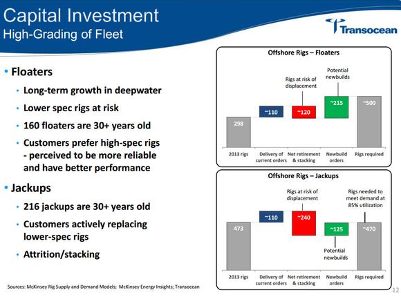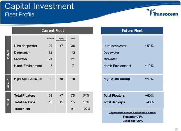 The industry needs to build hundreds of future drilling rigs just to maintain its current rig count, as older rigs are at risk of being replaced with newer, higher-specification drilling rigs. Transocean actually sees this as an opportunity to refresh its fleet ahead of that curve. As this next slide notes, the company plans to completely unload its fleet of deepwater and midwater drilling rigs and concentrate on ultra-deepwater, harsh environment, and high-spec jackups.