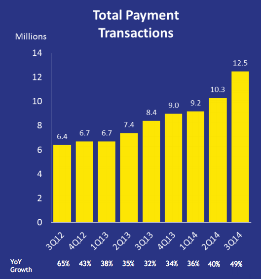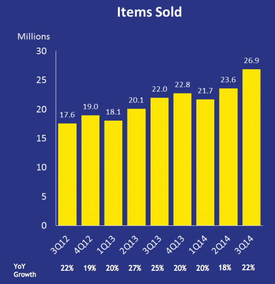 The company has 115.2 million confirmed registered users as of the end of the quarter, a 21.3% increase versus the third quarter in 2013. Items sold grew 22.3% year over year, to 26.9 million units in the quarter. Payment transactions via MercadoPago jumped by an impressive 48.8%, from 8.4 million in the third quarter of 2013 to 12.5 million in the last quarter.