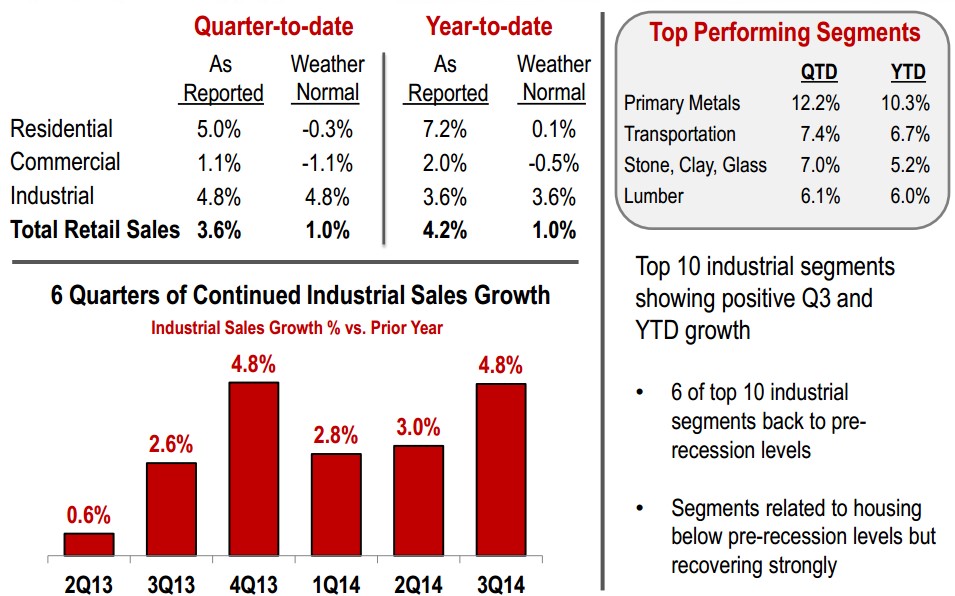 On the regulated front, the utility's guaranteed return on equity means that there's essentially only one simple way to increase profit: increase sales. So far for 2014, weather-normalized sales paint a mixed picture. While Southern's residential customers are essentially unmoved and commercial tapered off, the industrial sector continues to consume more energy.