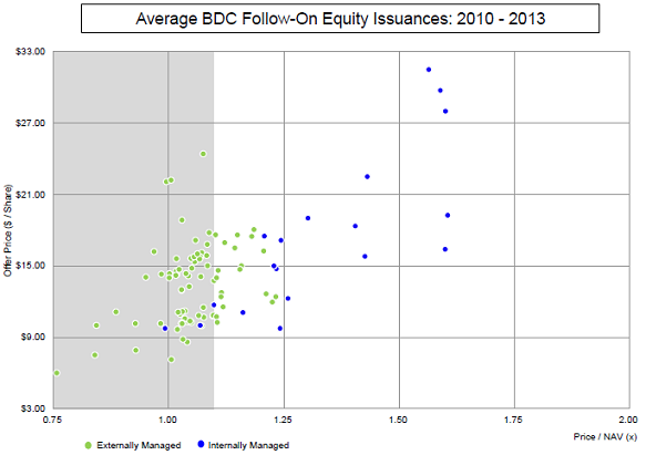 So, let's go back to the chart. You'll notice that externally managed BDCs have historically issued substantially more shares under their last-reported net asset value than internally managed BDCs. And when they issue shares above book value it's rarely at a big premium -- only a few percentage points. Internally managed firms, by contrast, have issued mainly above net asset value, and at large multiples of NAV.