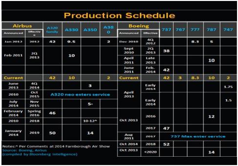 Considering these factors Boeing's strategizing to increase the production level to 52 a month, so that it can dispatch 620 737s a year, significantly up from 504 now. If the company proceeds with the output plan for all its jets, including the 777 and 787 wide-bodies, then its annual deliveries could shoot up to 900 from 648 delivered in 2013, and around 725 expected in the current fiscal year.