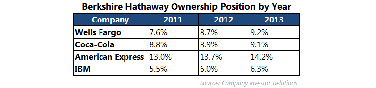 Berkshire Hathaway's ownership of each of the big four has grown over the last few years thanks to its purchase of larger positions in Wells Fargo and IBM plus the share repurchase efforts of the management teams at Coca-Cola and American Express.