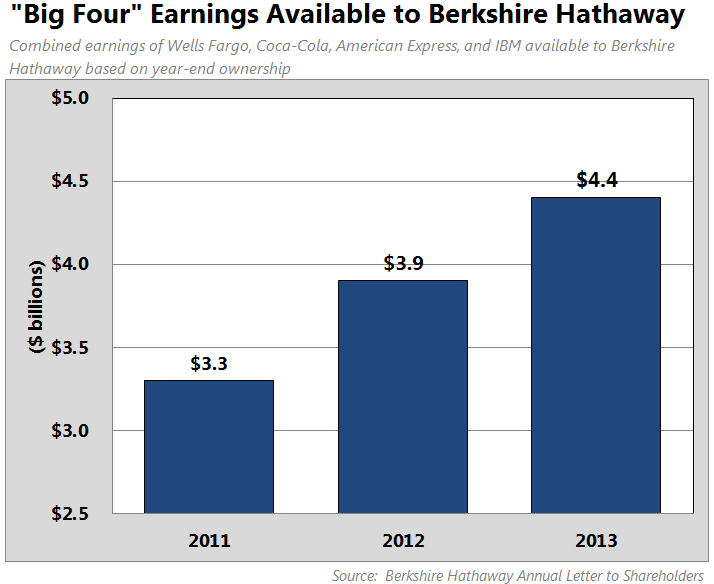 As a result of both increased ownership and the continued success of Buffett's "Big Four," the portion of earnings available to Berkshire -- although only the dividends paid out show up on its financial statements -- has grown dramatically since 2011: