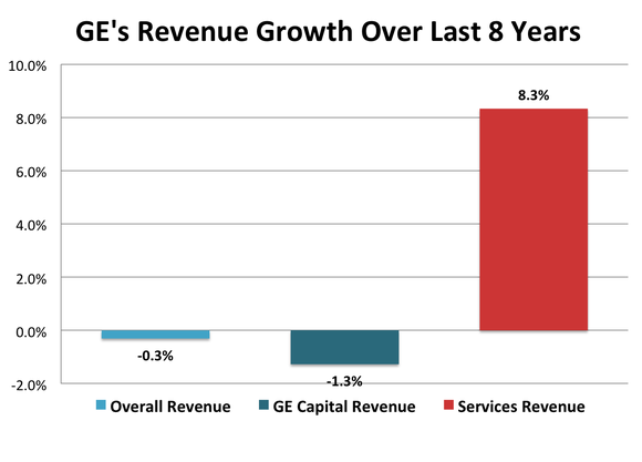 What's more, services are growing. Once again, this segment is outpacing the rest of GE's business, making up ground at a company that was hit hard by the financial crisis: