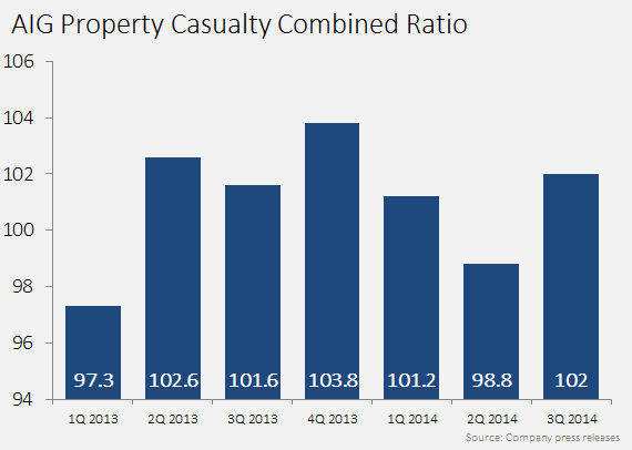 Not all segments showed dramatic improvements, however. AIG Property Casualty reported a "very AIG" quarter, reflecting a combined ratio of 102, up 0.4 points from the same period last year. The combined ratio measures loss and operating expenses as a percentage of earned premiums. A ratio below 100 is ideal, because it indicates that the company earns a profit from underwriting, not just income earned by investing its premiums.