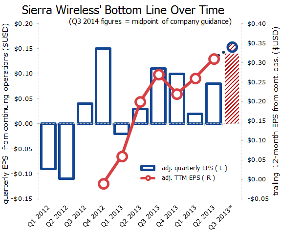 In most cases, we would examine a company's final EPS figures, which include all sources of income, but Sierra's comprehensive EPS from 2012 and 2013 doesn't paint an accurate picture of the company's progress, as it included gains from the AirCard business and its eventual sale. We'll instead focus on Sierra's EPS only from continuing operations, which shows a company that's rapidly improved its profitability since divesting AirCard: