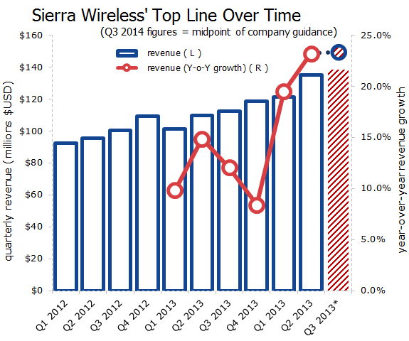 Sierra sold off its AirCard business early in 2013, which forced the company to modify the way it reported its finances for already-completed quarters to discount the impact of the divested segment. As a result, Sierra's "current" financial data ex-Aircard only dates back to the start of 2012 -- but that's still enough time to give us a reasonable picture of progress. The refocused Sierra has been fairly consistent at growing its top line, but its growth has actually improved throughout 2014: