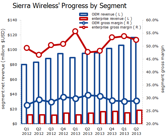 It's hard to represent the growth of Sierra's much smaller enterprise segment when it's side-by-side with a segment that's consistently brought at least 85% of the company's total revenue for the past two and a half years, but what we can see is that its gross margin is usually about twice as large as Sierra's OEM segment. However, it is worth noting that enterprise segment revenue is growing faster than OEM revenue, with the former up by 40% in two years (from the second quarter of 2012 to the second quarter of 2014) and the latter up by 52% over the same time frame.