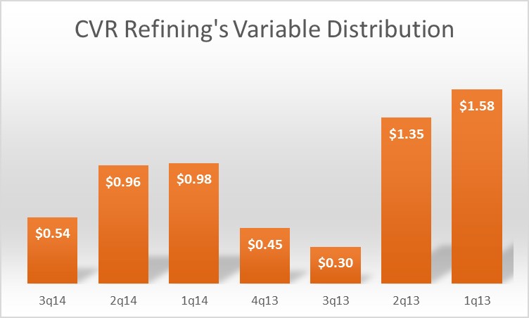Because of its structure and assets, CVR Refining's distribution policy is a bit different from most other MLPs. It pays a variable distribution, meaning it provides all of the available cash generated each quarter, as opposed to distributing a set amount to investors. This system creates a particularly lumpy distribution, as seen in the following chart.