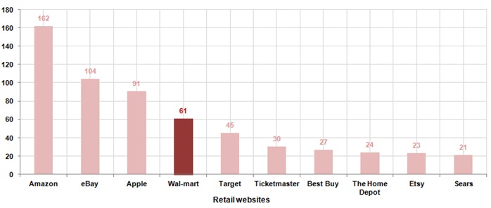 Amazon.com (AMZN +0.40%) tops the visitors chart, with an average of 162 million folks visiting the site in a month. Wal-Mart comes in fourth with an average of 61 million visitors. In 2013, Wal-Mart's online sales climbed 30% to top $10 billion, and the company expects to see a similar surge this year, with $12.5 billion in sales.