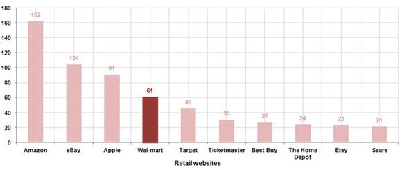 Amazon.com (AMZN 2.80%) tops the visitors chart, with an average of 162 million folks visiting the site in a month. Wal-Mart comes in fourth with an average of 61 million visitors. In 2013, Wal-Mart's online sales climbed 30% to top $10 billion, and the company expects to see a similar surge this year, with $12.5 billion in sales.
