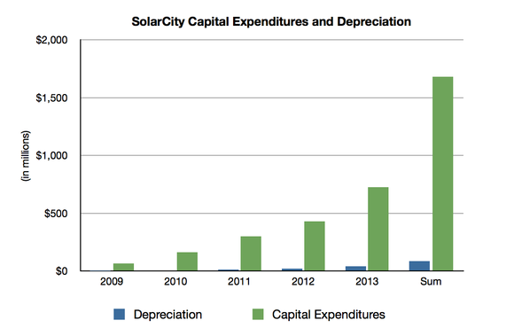 What's unique about SolarCity's business is that it's making thousands of small capital expenditures that will pay off for 20-30 years into the future. As these systems age, they're depreciated over 20-30 years, depending on their useful life. When looking at a company like SolarCity, if the investment made in capital expenditures is higher than the cost associated with depreciating older solar systems, we should expect growth in revenue and, potentially, earnings (which I'll cover below).