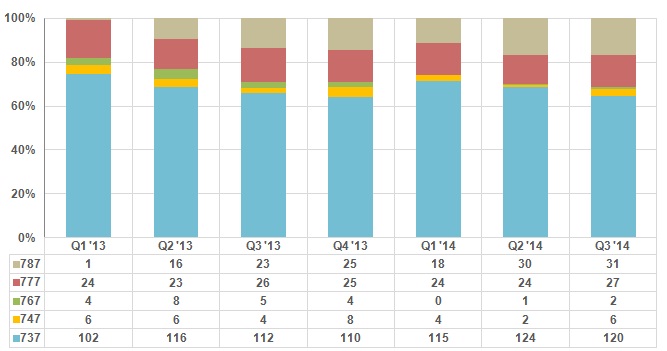 Aircraft delivery trend in the past seven quarters, Data source: Boeing