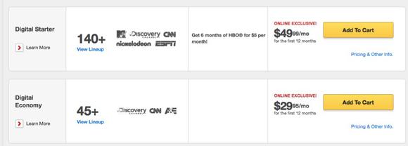 The company very clearly shows pricing for its various packages of channels on its website, all of which include the major broadcast networks. The "Digital Starter" package for example is touted as costing $49.99 per month for the first 12 months.