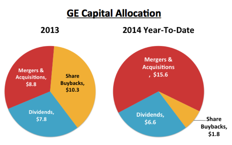 But fast-forward to 2014 -- shown on the right above -- and it's a pie chart of a slightly different coloring. GE's investing its extra cash in acquisition-related activities more so than in dividends and buybacks.