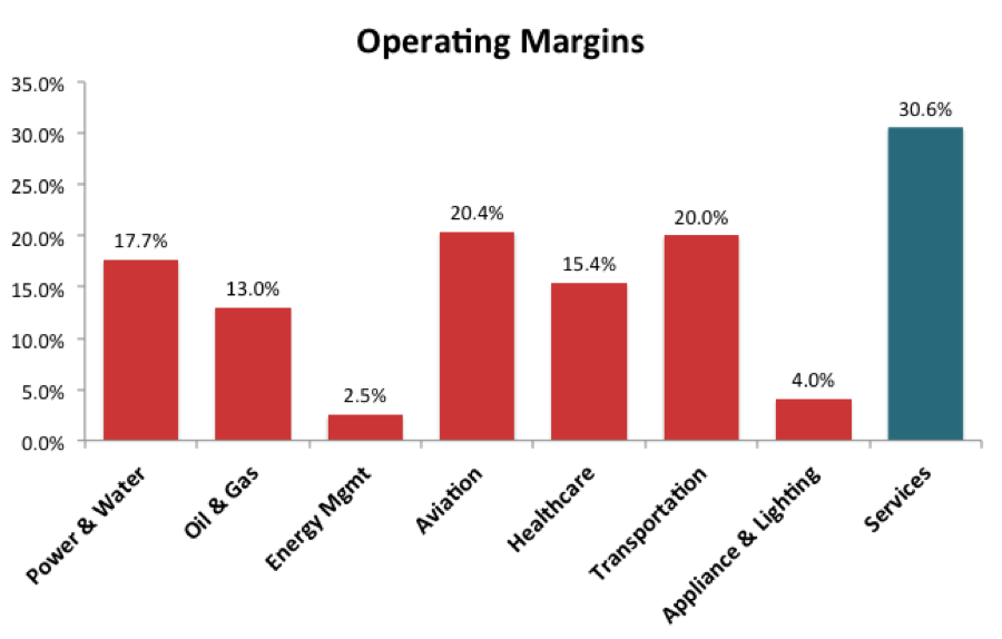 The chart below shows how the operating margins from services -- which is not a stand-alone segment but is shown separately for comparison -- tower over the operating margins generated by GE's industrial businesses: