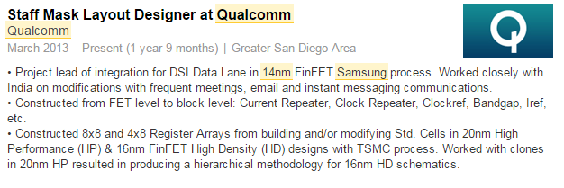 Indeed, DigiTimes reported back in July that the "Samsung/Globalfoundries team" landed 14-nanometer orders from Qualcomm and Apple. In fact, a quick search on LinkedIn reveals the profile of a Qualcomm engineer who claims to be designing next-generation Qualcomm chips on Samsung's 14-nanometer process:
