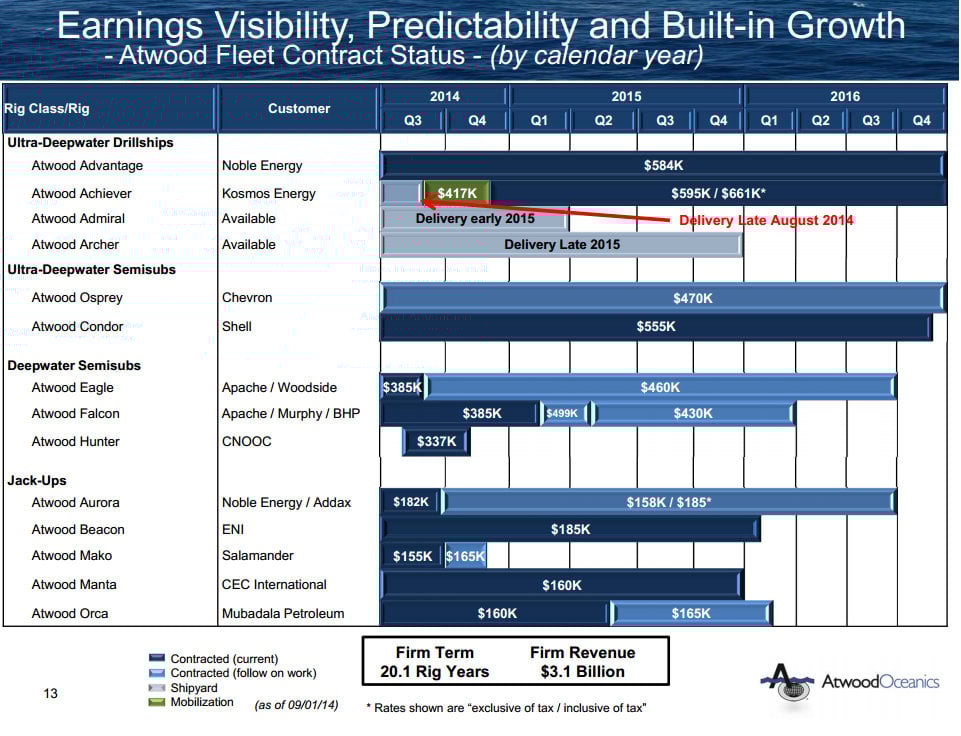 Atwood Oceanics (ATW +0.00%) filed its fleet status report this week, and unexpectedly announced that it would postpone the delivery of two newbuild vessels. The Atwood Admiral now won't be delivered until September of next year, while the Atwood Archer is delayed until June 2016. As the following slide notes, both rigs were expected to be delivered next year.