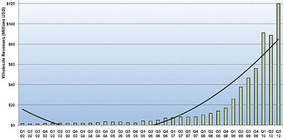 Before the original Kindle launched in 2007, the e-book market was still nascent and fragmented. To be clear, many companies had released e-readers, most of which supported the open e-pub format, but the market had yet to take off in a meaningful way. Consider this chart of U.S. trade wholesale e-book sales through late 2010.