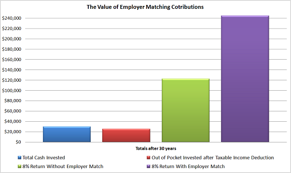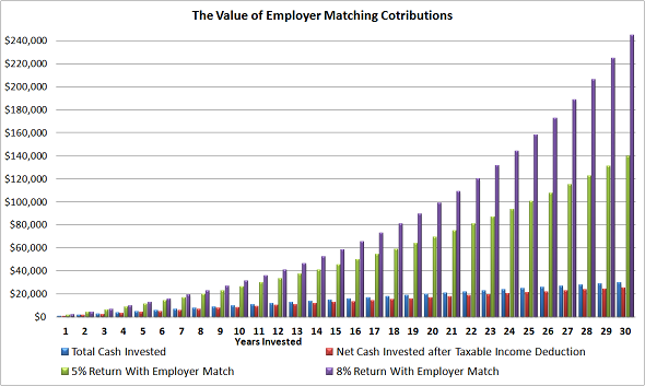 How important are employer contributions? According to a Department of Labor study, employees contributed $185.7 billion to Defined Contribution plans in 2011, while employers added $122.1 billion, good for almost 40% of total contributions. Between the tax benefits and the employer match, it's downright hard to fathom why anyone would not contribute at least something. Here's how powerful employer matching funds can be over time: