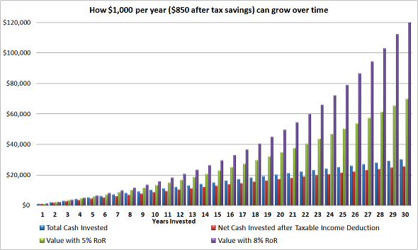 What does 8% annualized mean? It means you double your money about every nine years. Saving $1,000 per year at 8% return over a 30-year career, would net $122,000. Even a 5% rate of return would turn that $30,000 into $69,000. Furthermore, the tax savings would mean your actual "out of pocket" would really be about $25,500.