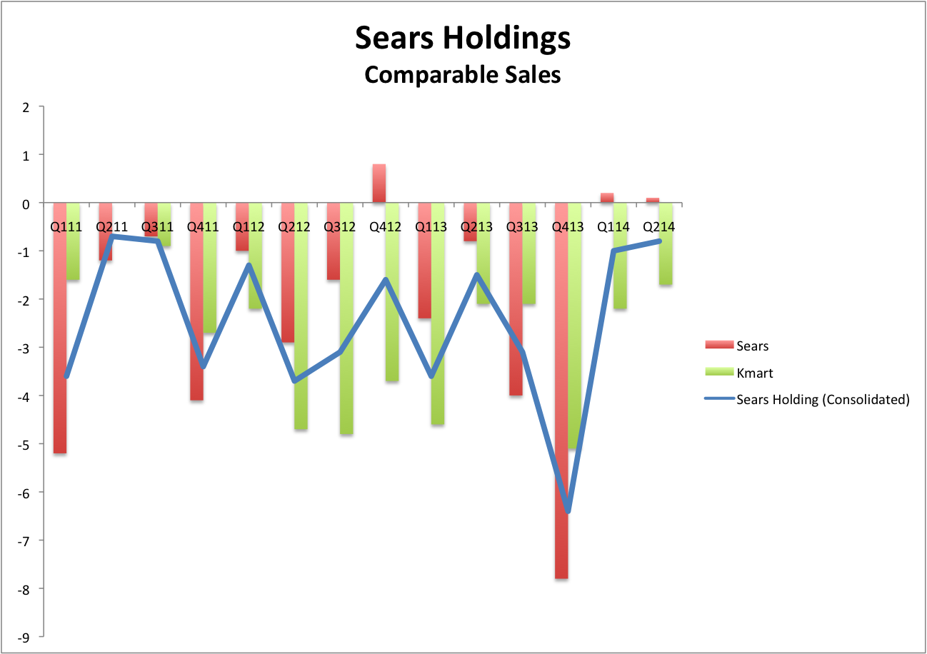 Same store sales have been on a prolonged slide and there's no indication that's about to change anytime soon. While Sears has initiated its Shop Your Way loyalty program to help bolster its numbers, and it accounts for nearly three-quarters of its sales, it appears to have topped out and may even be in decline. Even if it holds steady, it's still eating away at Sears profits because the retailer continues to run twin promotional campaigns.