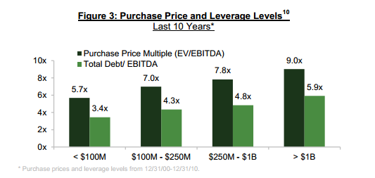 This is a chart from Flag Capital showing the pricing discrepancies between small and large private companies. You should notice a trend: the bigger the private company, the bigger the EV/EBITDA multiple you pay to buy it. Although the valuation obviously varies by industry, the general rule holds true that smaller companies beget smaller valuations, and vice versa.