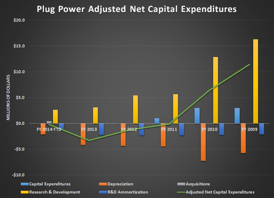 As you might expect, the majority of Plug Power's spending has been related to research and development. Not only does it need to put the money into its hydrogen fuel cell systems to make them economical, but in previous years the company did pull in revenue through some research and development contracts. With that in mind, here is how Plug Power has been spending its money since 2009 based on the figures in its financial statements, compiled by S&P capital IQ.