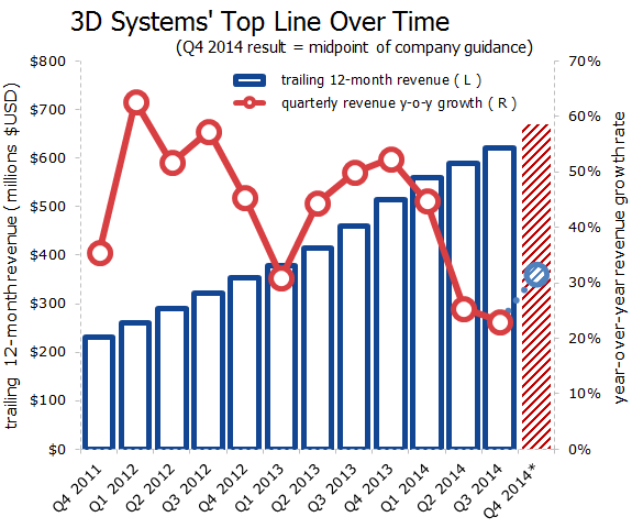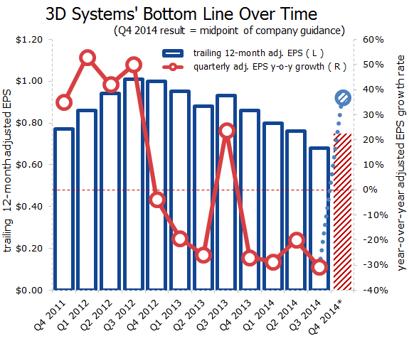 The third quarter continued an unwelcome trend of declining growth, but it appears that investors are willing to overlook the recent past in the hope that 3D Systems can live up to its promises in the final quarter of 2014. The third quarter was the fourth consecutive quarter of lower sequential year-over-year revenue growth, and it was the seventh of the company's eight most recent quarters in which adjusted EPS was lower than it was the year before. However, both top and bottom lines look likely to reverse their trends in the fourth quarter, as 3D Systems expects revenue to rise 31.6% year over year, and also expects adjusted EPS to be higher year over year for the first time since the third quarter of 2013. The midpoints of both 3D Systems' top- and bottom-line guidance ranges also narrowly surpass what analysts had expected for the fourth quarter -- Wall Street had been looking for $203.7 million on the top line and $0.25 in adjusted EPS, but 3D Systems is effectively anticipating $203.4 million in revenue and $0.26 in adjusted EPS.