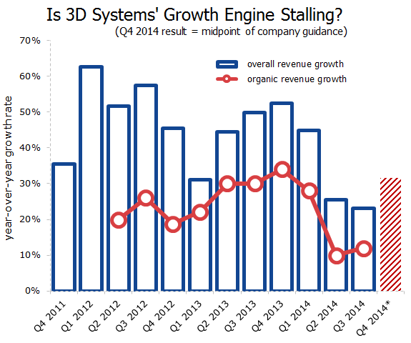 This is the third consecutive quarter in which 3D Systems has blamed shrinking margins on "growing pains," only now it's starting to blame its lower-than-expected revenue on these growing pains as well, as Reichental also pointed out that "[3D Systems] failed to fully capitalize on the robust demand for our direct metal and consumer products." The company's inability to serve this demand resulted in organic revenue growth of just 12% for the quarter, the second-lowest organic growth rate reported since 3D Systems began offering this metric in its reports in mid-2012: