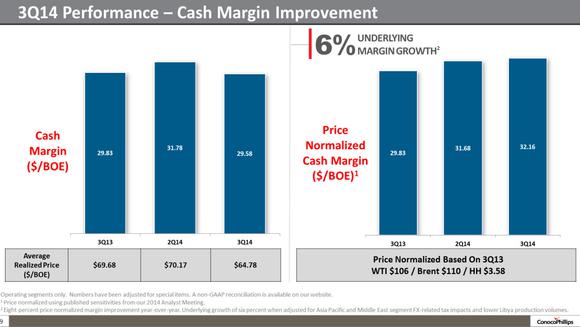 CEO Ryan Lance started off the conference call noting that, from ConocoPhillips' perspective, the plunge in oil prices couldn't have come at a better time in the company's history. This is because the company's repositioning plan is complete and now its business is more flexible than ever. Last year was the peak year for spending on major projects and with that now in the past, the company can cut spending as it responds to market conditions: something it couldn't do as quickly just last year.