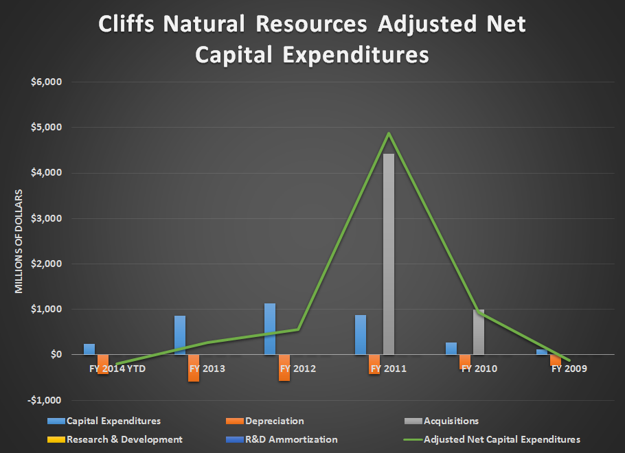 The mining of iron ore and metallurgical coal isn't exactly an activity that requires lots of money for research and development. What it does need, though, is lots of capital spending on equipment that wears down over time. Also, when it comes time to open a new mine, capital costs can be very large and can take many years. With this in mind, it's not really shocking that Cliffs hasn't spent a dollar on research and development in the past five years, but it still has spent a lot of money on other things. Based on the financials of Cliffs, compiled by S&P Capital IQ, the company's adjusted net capital expenditures have looked like this since 2009: