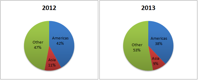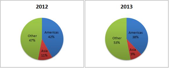 Weakness in key markets is another big factor driving Westport's revenue down. The company segregates its revenue on the basis of three regions : Americas, Asia, and Other. The following pie charts show Westport's revenue breakup by geography for the past two financial years. You'll be surprised to know which region contributes the bulk to the company's top line.