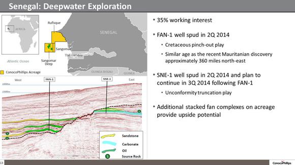 ConocoPhillips offshore drilling exploration program has been the poster child of the offshore drilling industry's rough year as it seems to take one step back for every step forward. So far this year the company's most recent well results in the Gulf of Mexico and Angola have resulted in dry holes. However, this week the company is back to taking steps forward as it announced a second oil discovery offshore Senegal. This second discovery is in the SNE-1 well, which is located about 60 miles offshore Senegal and is noted on the following slide.