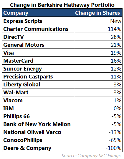 Although we are always interested in the new things Buffett is buying, the biggest shift in terms of a raw dollars basis came from the additional shares purchased of DirecTV (DTV +0.00%) and Charter Communications (CHTR +0.01%).