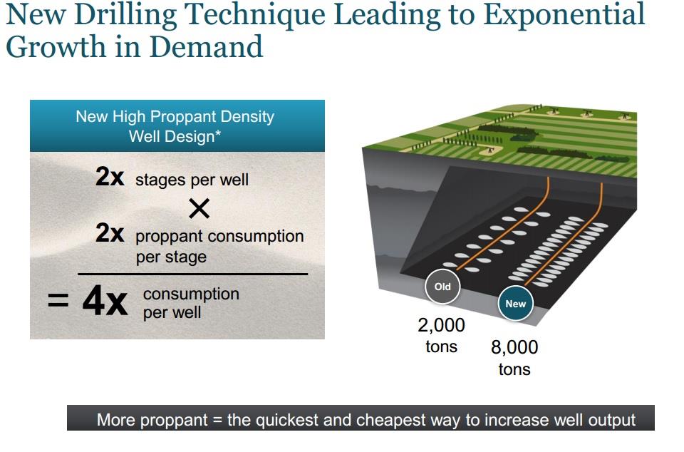 In fact, thanks to these new drilling techniques the volume of sand consumed by the average well has doubled from 2,500 tons to 5,000 tons, with some wells using as much as 8,000 tons of sand.