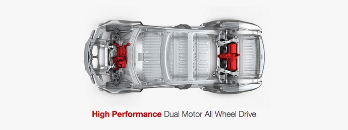 The dual-motor system was introduced for the Model S in October. It features a more powerful motor on the rear axle and a smaller, less powerful motor on the front axle. The motors both digitally and independently control torque on the front and rear wheels. Source: Tesla Motors.