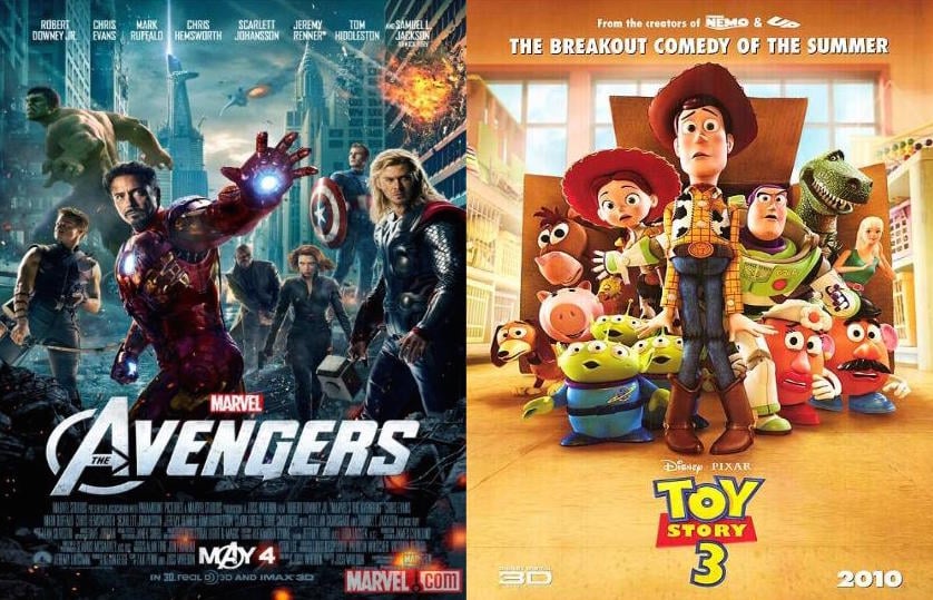 Between them, Marvel's The Avengers and Toy Story 3 have brought Disney more than $2.5 billion in worldwide box office grosses. Credits: Marvel Entertainment, Pixar Animation Studios.