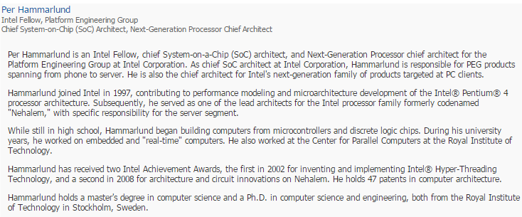 In fact, if you want some concrete evidence of this, look at the following corporate biography of Intel Fellow Per Hammarlund: