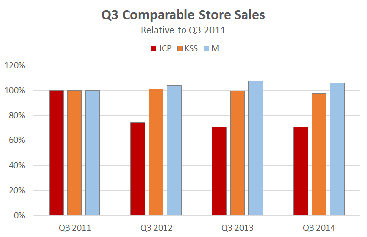 On the surface, J.C. Penney's third quarter doesn't look all that bad. Compared to competitors Kohl's (KSS 0.14%) and Macy's (M +0.67%), which both reported declining comparable-store sales during the third quarter, J.C. Penney's flat comps seem like a relatively good result. But a simple comparison ignores the results of the past few years, when J.C. Penney's sales fell off a cliff, and the comparison is much less kind when all of the data are considered: