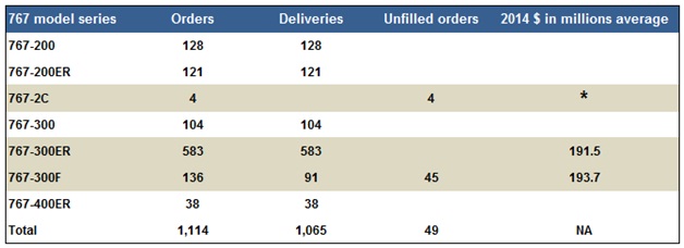The 767 family so far has received orders for more than 1,100 units. Boeing will be delivering its 1,065th 767 by the end of this year. The top-selling 767 model series, 767-300ER, saw its backlog dry up after deliveries of all 583 planes, with the last one going to Air Astana. Presently, Boeing has unfilled orders for 45 767-300Fs, all of which are to be delivered to FedEx, and four 767-2Cs that are to be delivered to the US Air Force. The 767-2C is a new commercial freight version build on the 767-200ER model.
