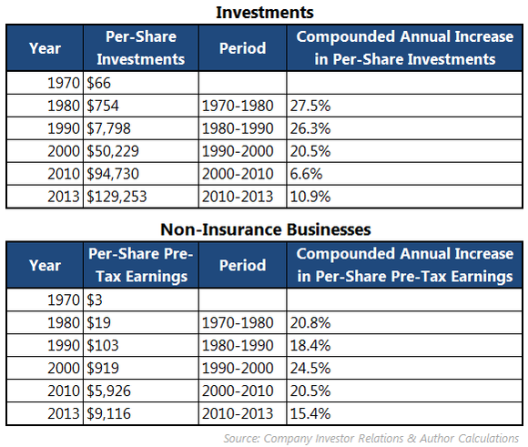 From 1990 to 2013, the per-share earnings from its noninsurance businesses grew at an average annual rate of 21.5%, while its investments rose at 13%.