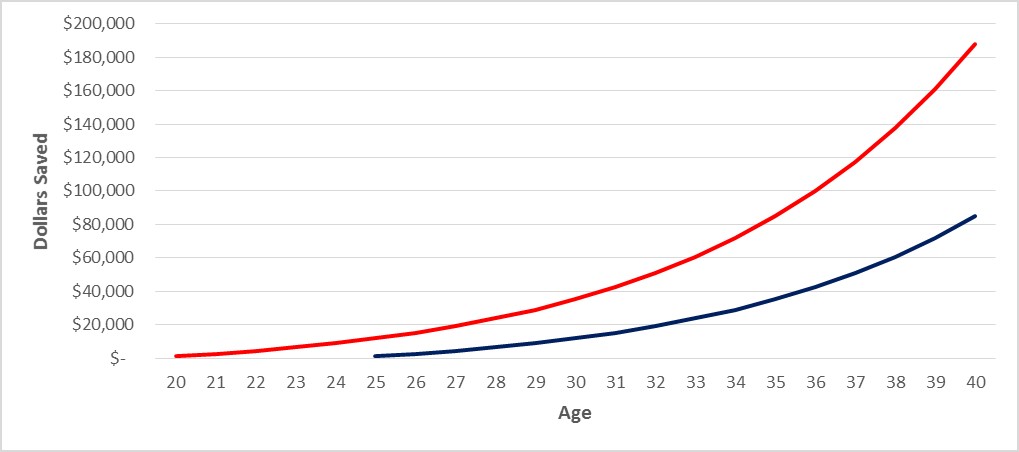 In the chart below, this student's savings are represented by the red line. Meanwhile, the blue line represents a fellow student who does everything the same except that she doesn't start saving until she's 25.