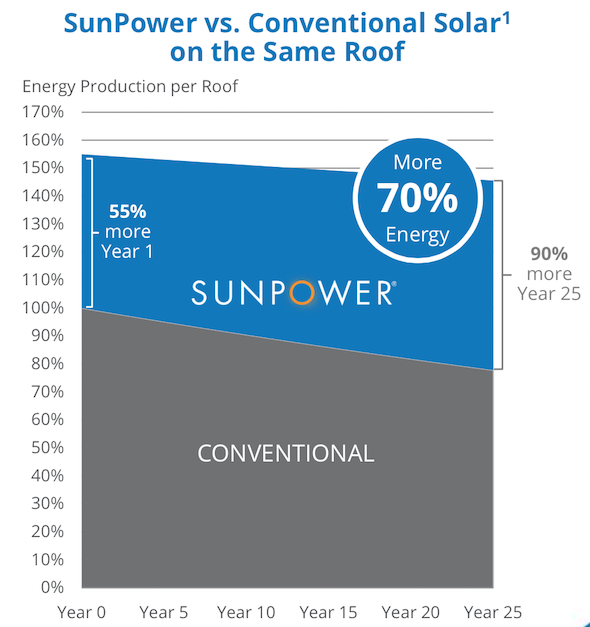 SunPower put its advantage in the chart below, which shows the initial advantage it has in rooftop solar -- because of efficiency -- and how its advantage over competitors grows over time because of lower degradation and greater durability.