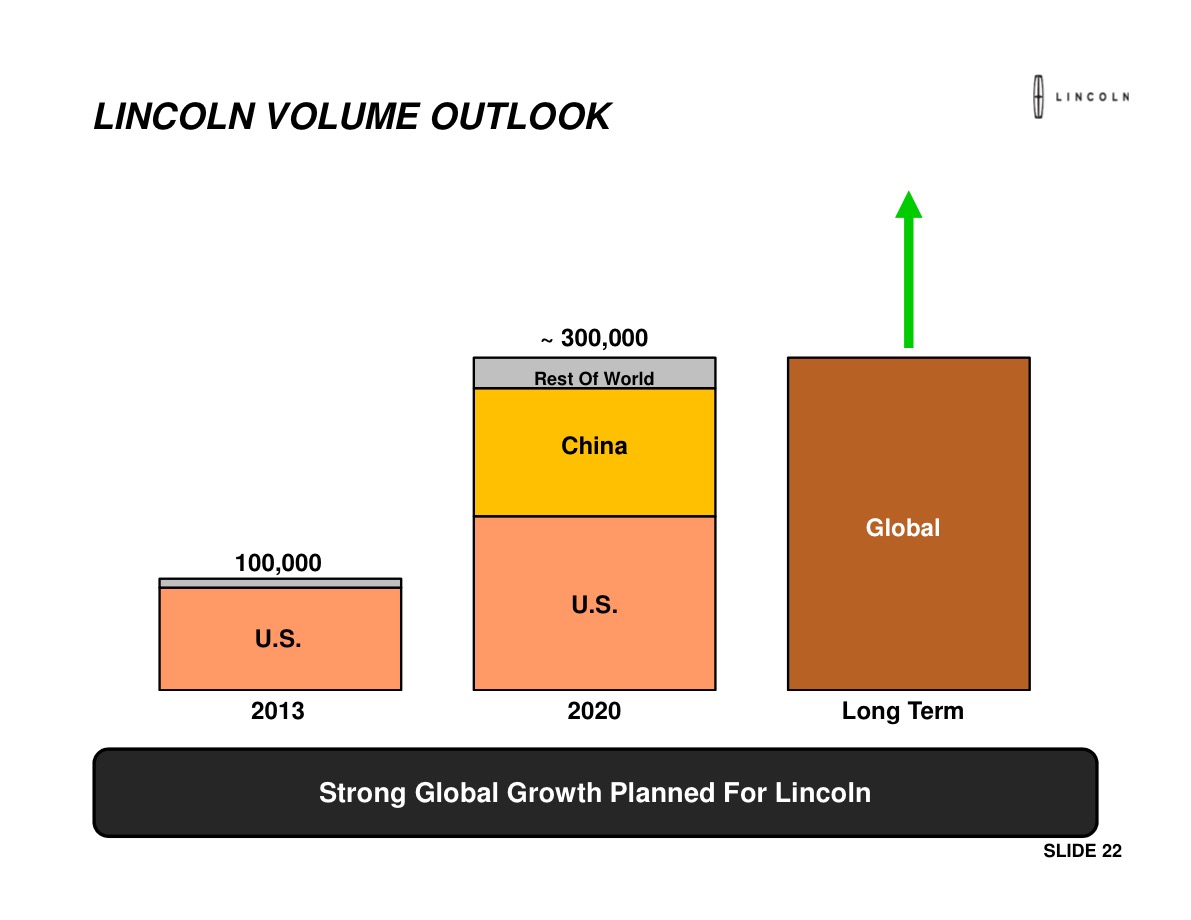 And Ford is hoping to grab a significant share of that profit pie. As you can see in this slide from his presentation, Galhotra's plan calls for Lincoln's sales to triple from about 100,000 last year to about 300,000 by 2020, with much -- but not all -- of the growth expected to come from China.
